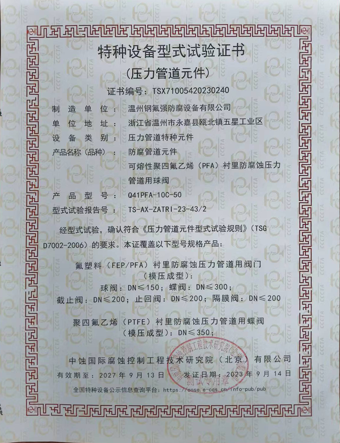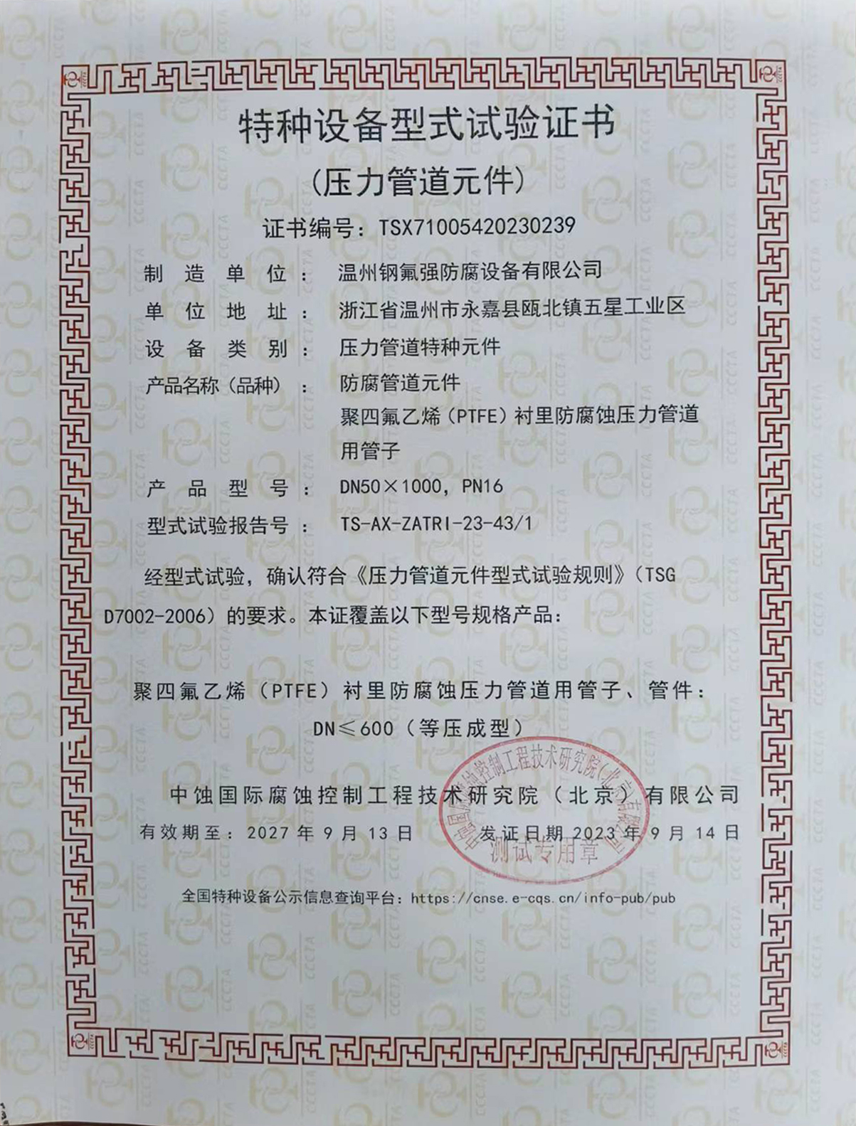 特種設(shè)備型式試驗證書(壓力管道元件) |
